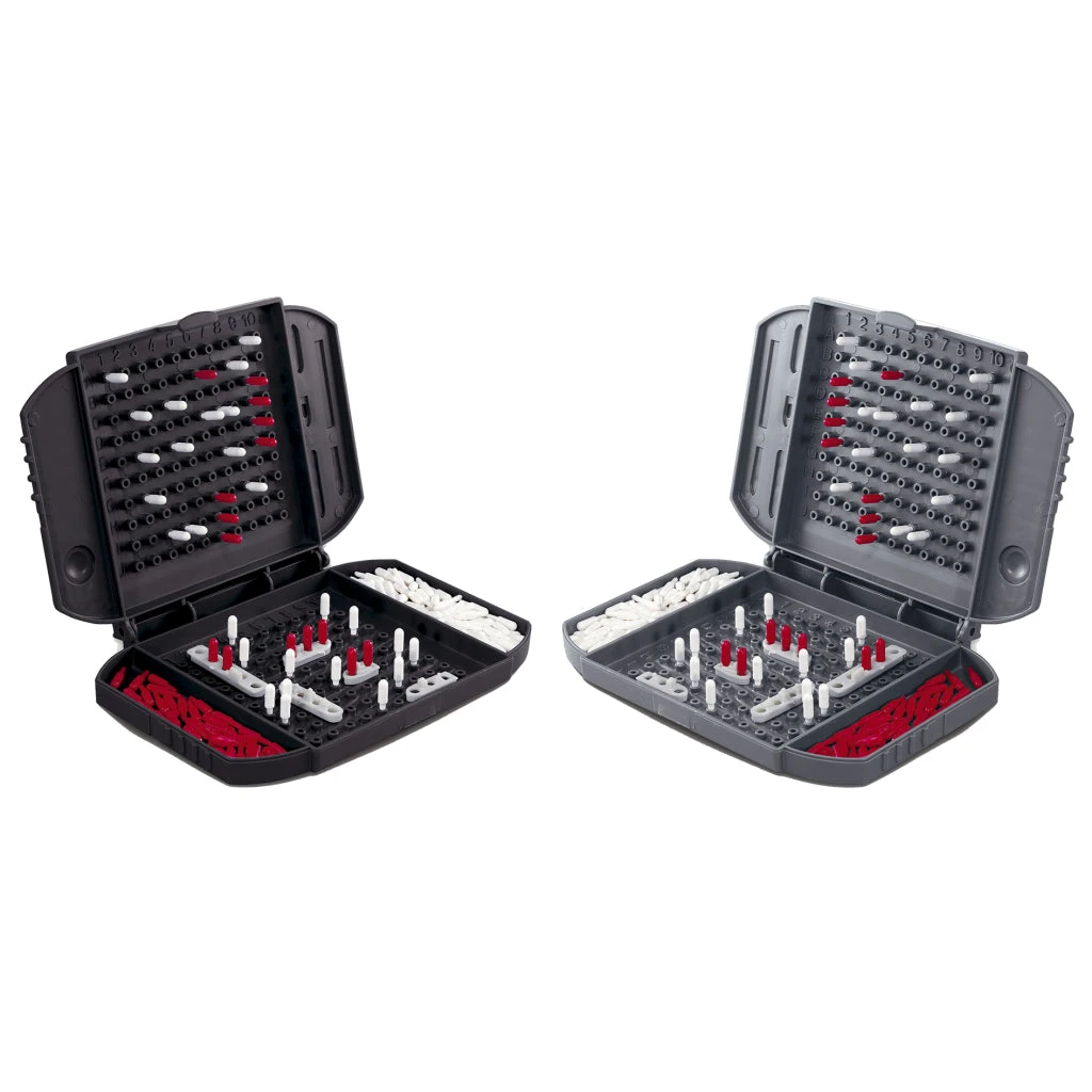 Leid je vloot ook onderweg naar de overwinning met dit compacte Zeeslag spel! Kun jij de vloot van je tegenstander tot zinken brengen voordat hij de jouwe naar de haaien stuurt? Jij bepaalt de strijd met je handige spelcassette. Plaats je vliegdekschip, slagschip, kruiser, onderzeeƫr en mijnenveger op het oceaanraster. Als de strijd voorbij is, berg je de pinnetjes en de schepen op inde cassettes en je schuift ze in elkaar. Plan je strategie en leid je troepen naar de overwinning!