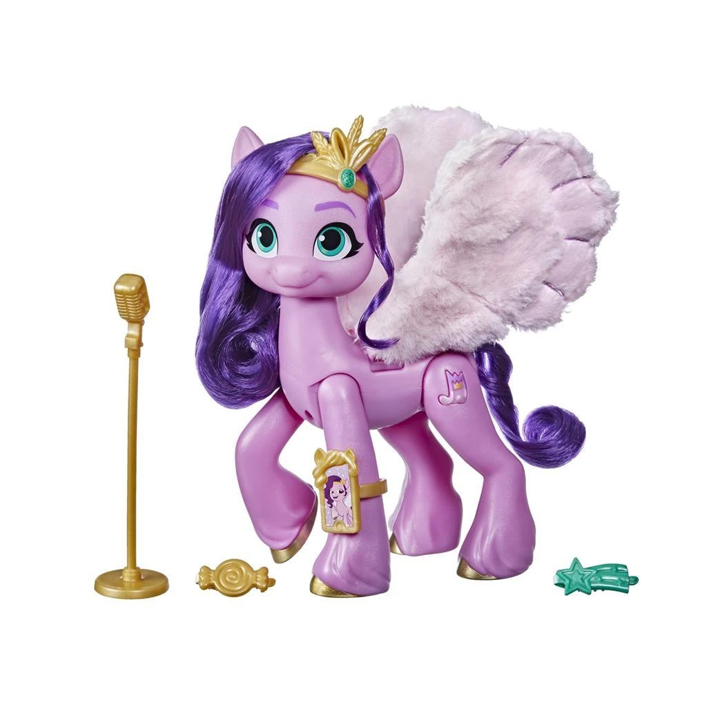 Maak kennis met Prinses Petals: een pegasus van Zephyr Heights! Prinses Petals is een stijlvolle en getalenteerde popster. Stel je voor dat de popster Prinses Petals optreedt op een koninklijk gala met deze figuur geïnspireerd op de film My Little Pony: A New Generation. Bevat een Prinses Petals roze ponyfiguur van 15 cm met een Cutie Mark in de vorm van een muzieknoot aan een kant. Het zachte, paarse haar van deze beweegbare figuur heeft haar kenmerkende krullen. Ze maakt ook muziek en maakt bewegingen! Druk op haar Cutie Mark en ze zal een deel van haar nummer ‘Glowing Up’ neuriën. Knijp haar benen samen om haar mooie, donzige vleugels op en neer te doen flapperen. Stel je voor dat Prinses Petals vliegt tijdens een optreden voor haar fans. De set bevat 5 accessoires waarmee kinderen haar kunnen klaarmaken voor het optreden. Fans van nu en vroeger kunnen zich avonturen voorstellen met speelgoed geïnspireerd op de film My Little Pony. Een leuk geschenk ter gelegenheid van een feest of verjaardag voor kinderen vanaf 5 jaar! My Little Pony en alle gerelateerde personages zijn handelsmerken van Hasbro.